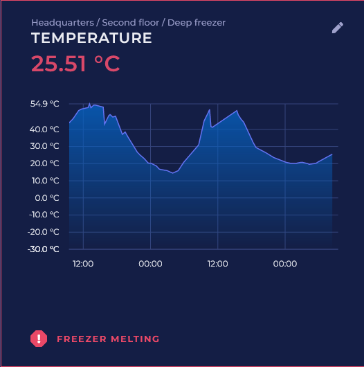 The Channel value and trend view widget displays the latest measurement result or graph for the selected channel over the last few hours or days, depending on your choice. Additionally, you can choose to display the notification status and tasks in the widget. The background color of the widget reflects the color of the most severe active notification for that channel.