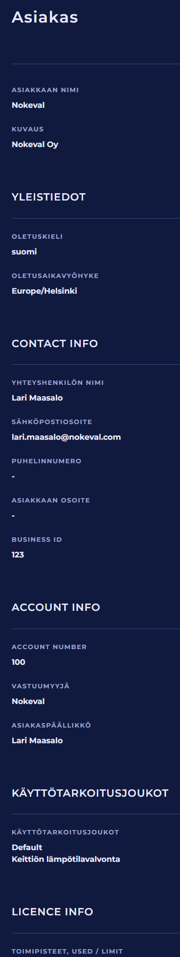 Asiakas-asetussivulta näet asiakastilisi perustiedot ja joitakin yksityiskohtaisempia tietoja.