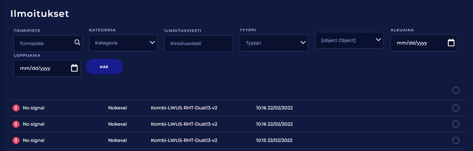 Ilmoitukset-sivulta löydät kaikki ilmoitusrajojen ylityksistä syntyvät ilmoitukset. Ilmoitusrajat määräävät milloin ilmoituksia muodostuu. Ilmoitusrajat määritellään kullekin suorituspisteelle erikseen.