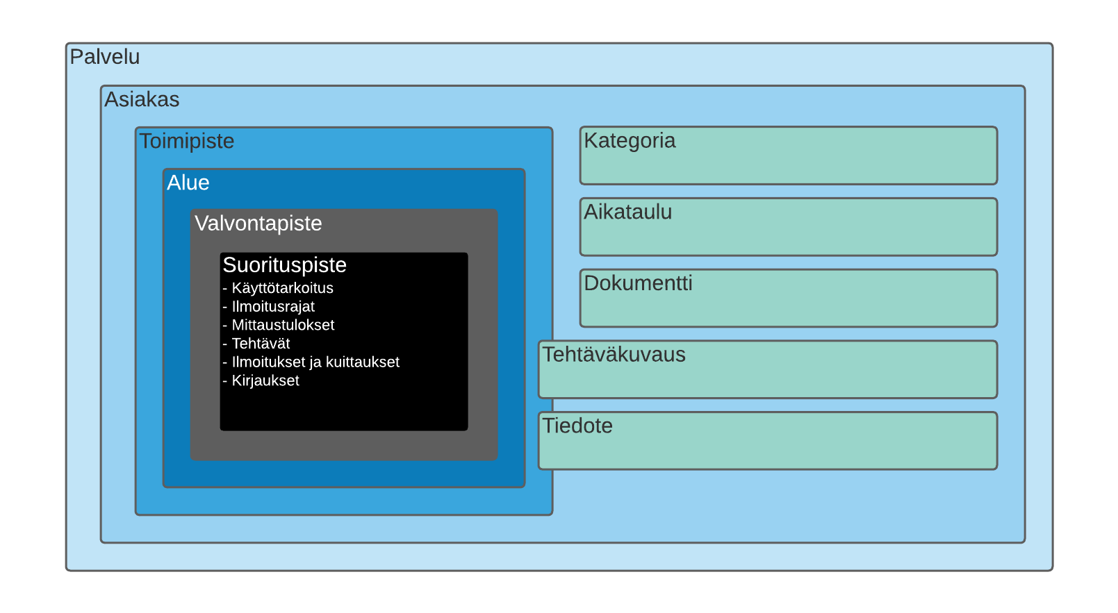 Tämä sivu kuvaa palvelun pääkäsitteet sekä niiden keskinäisen hierarkian. Käsitteiden ja hierarkian ymmärtäminen auttaa mallintamaan haluttu kohde palveluun mahdollisimman loogisella tavalla.