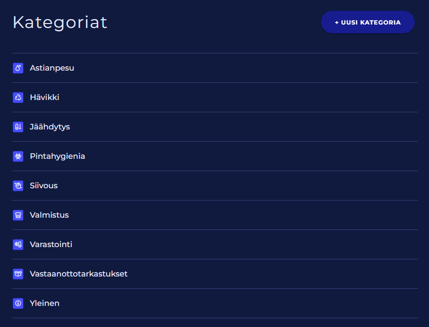 Kategorioiden avulla voit muodostaa ja hallita loogisia kokonaisuuksia. Ne muodostavat myös omavalvontasuunnitelman sisällysluettelon.