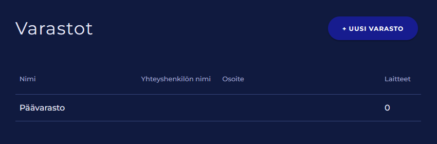 Laitevarastot-asetussivulta näet asiakastilin laitevarastot, voit muokata niitä ja luoda uusia laitevarastoja.