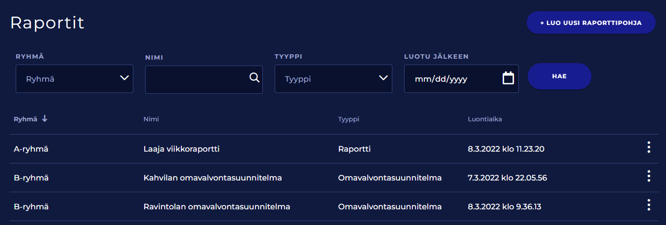 Voit hakea ja suodattaa luettelossa näytettäviä raporttipohjia raportin ryhmän, nimen, tyypin ja luontipäivän mukaan. Syötä tai valitse ensin hakukriteerit ja napsauta sitten Hae.