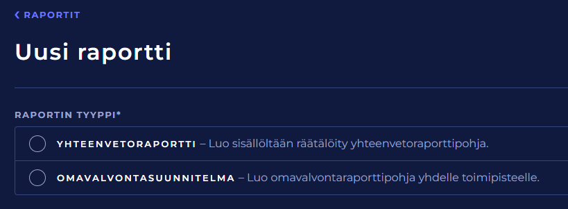 Valitse raportin tyyppi. Et voi vaihtaa raporttipohjan tyyppiä enää sen ensimmäisen tallentamisen jälkeen.