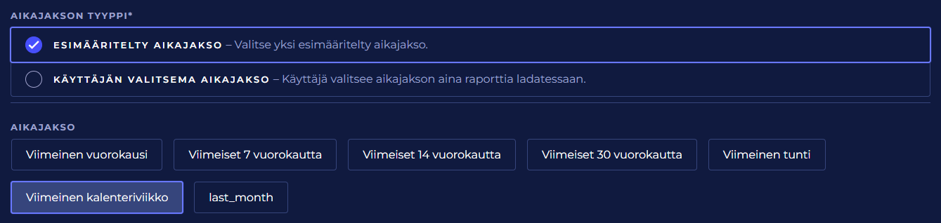 Käyttäjän valitsema aikajakso | Raportin lataaja valitsee raportin aikajakson aina ennen kuin raportti muodostetaan ja ladataan käyttäjälle. Raporttipohjia, joiden aikajakson tyyppi on “Käyttäjän valitsema aikajakso”, ei voi tilata ajastetusti. |