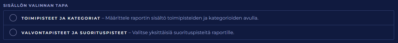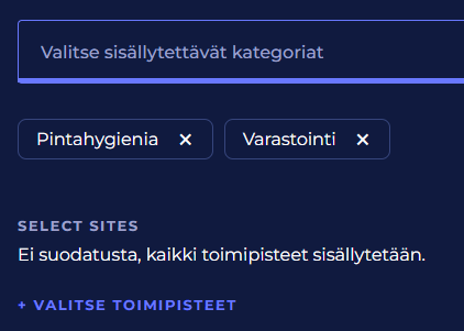 Toimipisteet ja kategoriat | Voit määritellä raportin sisällön valitsemalla mitkä toimipisteet sisällytetään raporttiin ja mitkä kategoriat. Valitsemiesi toimipisteiden valitsemiisi kategorioihin kuuluvien valvontapisteiden tiedot sisällytetään raporttiin. Jos et valitse mitään toimipistettä tai kategoriaa, sisällytetään raporttiin kaikkien toimipisteiden kaikkien kategorioiden valvontapisteet. ![]() |