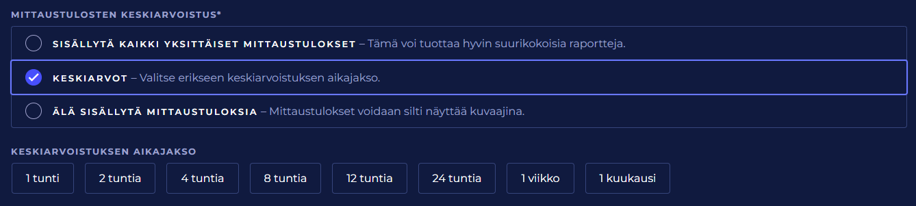 Keskiarvot | Suorituspisteiden keskiarvoistetut mittaustulokset sisällytetään raporttiin luettelomuodossa. Keskiarvoistuksen aikajaksoksi on valittavissa: