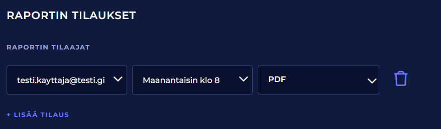 Viimeisenä kohtana raporttipohjan muokkausruudulla on raportin tilausten hallinta. Tilaajien listalle voi lisätä palvelun käyttäjiä ja valita tilauksen yhteyteen aikataulun, jonka mukaan raportti luodaan ja lähetetään automaattisesti sähköpostilla.