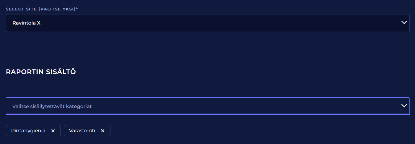Valitse kategorialistalta omavalvontasuunnitelmaraportille sisällytettävät kategoriat. Jos et valitse yhtään kategoriaa, sisällytetään automaattisesti kaikki kategoriat.