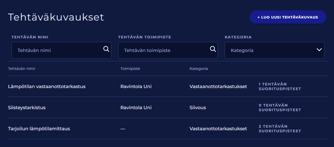 Tehtäväkuvausluettelossa näkyy tehtävän nimi, toimipiste (jos tehtävä on toimipistekohtainen), kategoria ja tehtäväkuvaukseen liitettyjen suorituspisteiden määrä.