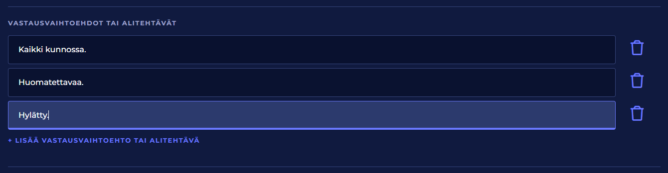 Voit lisätä tehtäväkuvaukselle tarvittavan määrän vastausvaihtoehtoja tai alitehtäviä, joita käyttäjä voi valita ja suorittaa tehtävän suorituksen yhteydessä.