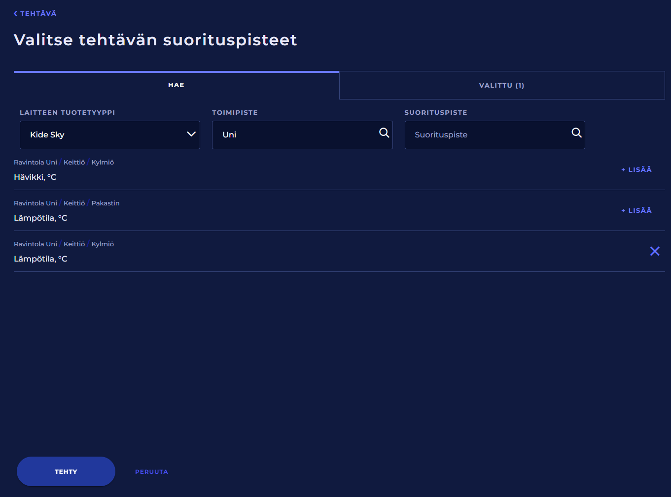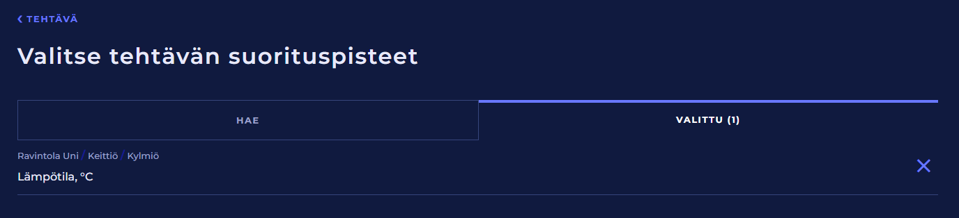 Tehtävän suorituspisteiden valitsemiseen on oma tehokas näkymä. Voit suodattaa sen avulla suorituspisteitä kategorian, mittaussuureen sekä toimipisteen ja suorituspisteen nimen tai niiden osan mukaan.