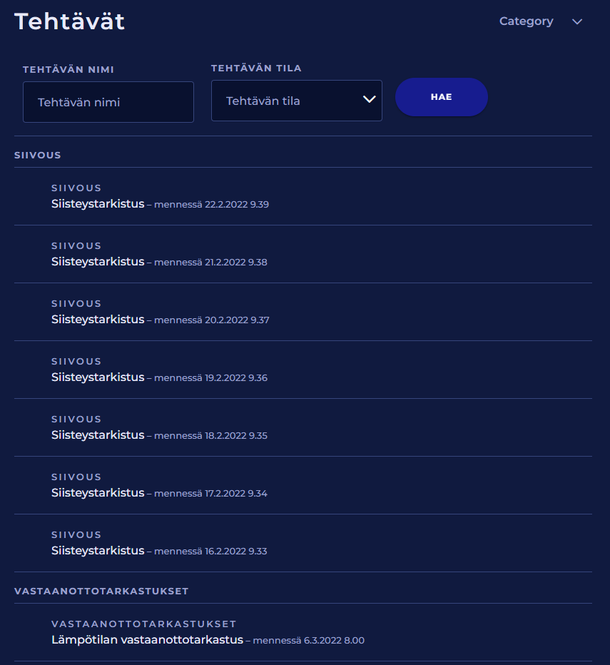 Voit suodattaa listaa tehtävän nimen ja tilan mukaan.