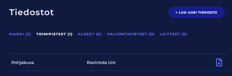 Tiedostot-sivulta näet kaikki toimipisteeseen tai sen alueisiin, valvontapisteisiin tai laitteisiin liittyvät tiedostot.