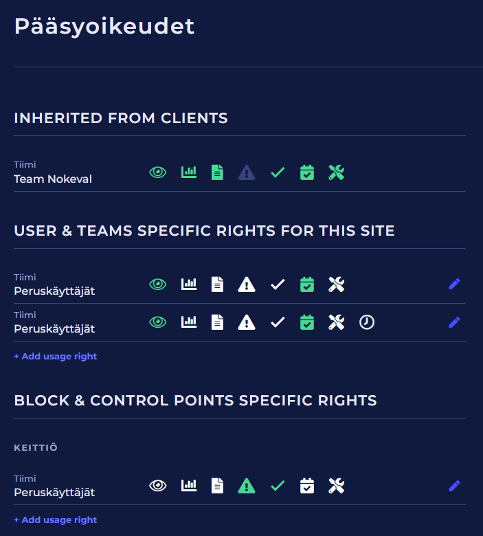 Lue lisää pääsyoikeuksien esitystavasta ja pääsyoikeuksien lisäämisestä, muokkaamisesta ja poistamisesta täältä: Tiimit → Pääsyoikeuksien lisääminen.
