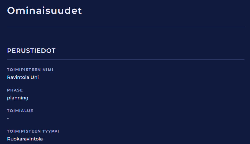 Tältä sivulta näet ja voit muokata toimipisteen ominaisuuksia, kuten perustietoja, yhteystietoja, lisätietoja ja alueita.