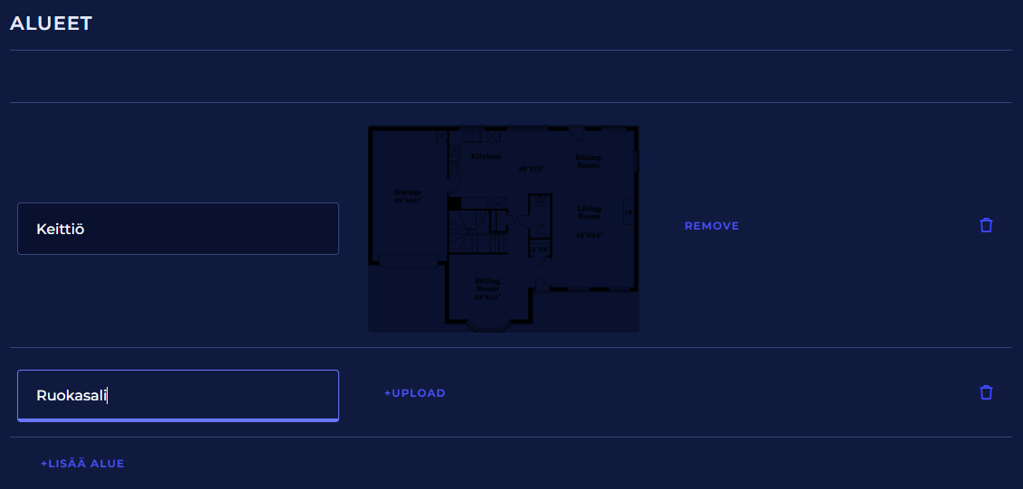 Voit poistaa koko alueen napsauttamalla sen roskakori-ikonia.