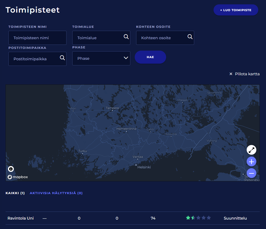 Toimipisteet-sivun kautta näet luettelon toimipisteistäsi ja voit lähestyä valvontatietoja maantieteellisesti ja toimipisteittäin.