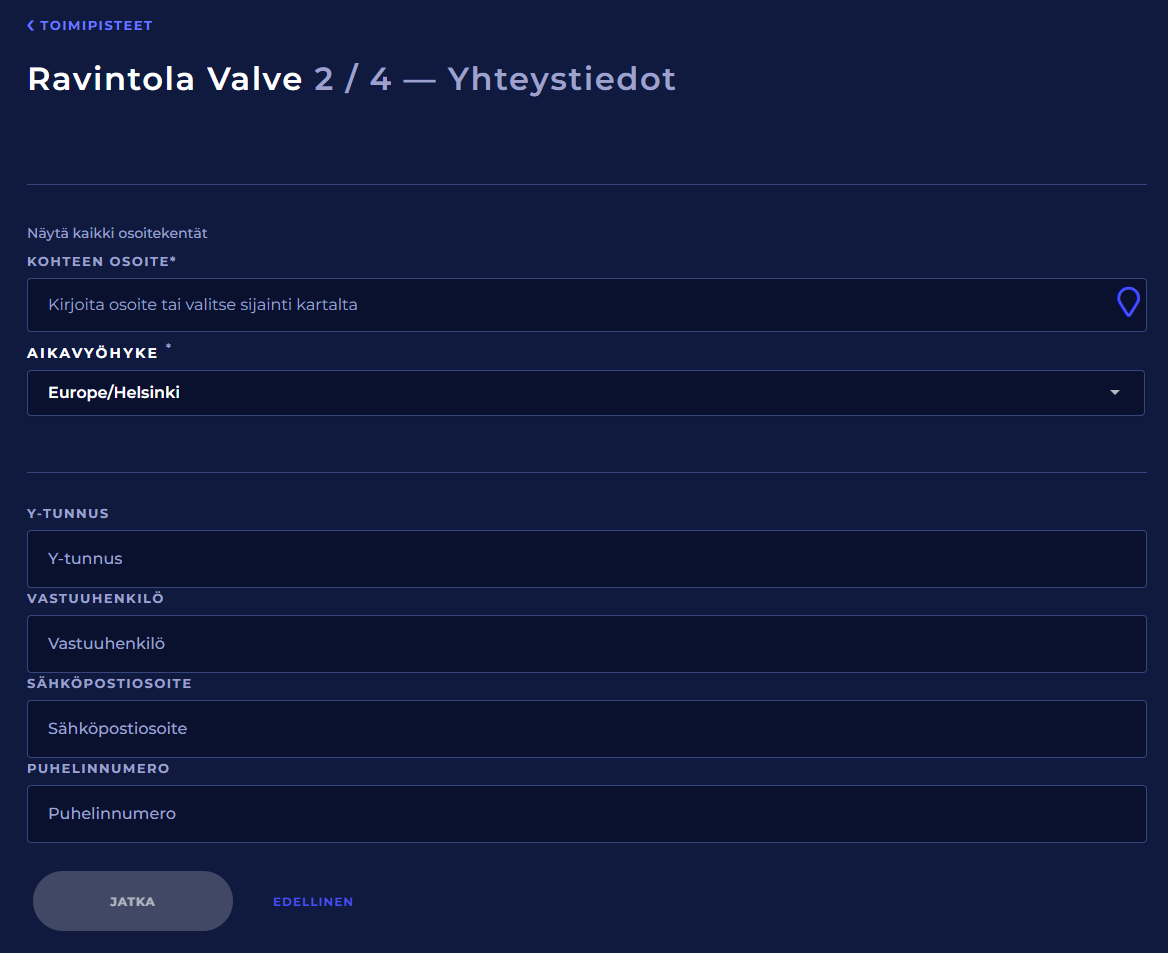 Syötä vaadittavat tiedot ja napsauta Jatka siirtyäksesi seuraavaan vaiheeseen. Voit peruuttaa toimipisteen luomisen Peruuta tai < Toimipisteet -linkistä.