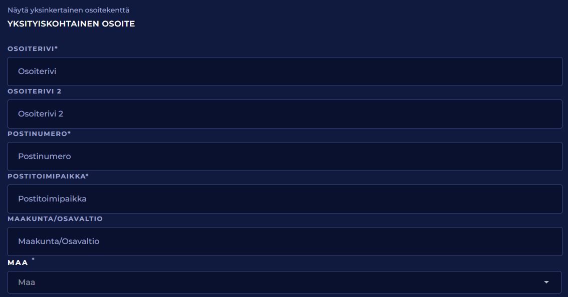 Nyt voit syöttää yksityiskohtaisen osoitteen. Palataksesi takaisin yksinkertaiseen osoitemuotoon, napsauta Näytä yksinkertainen osoitekenttä -linkkiä.