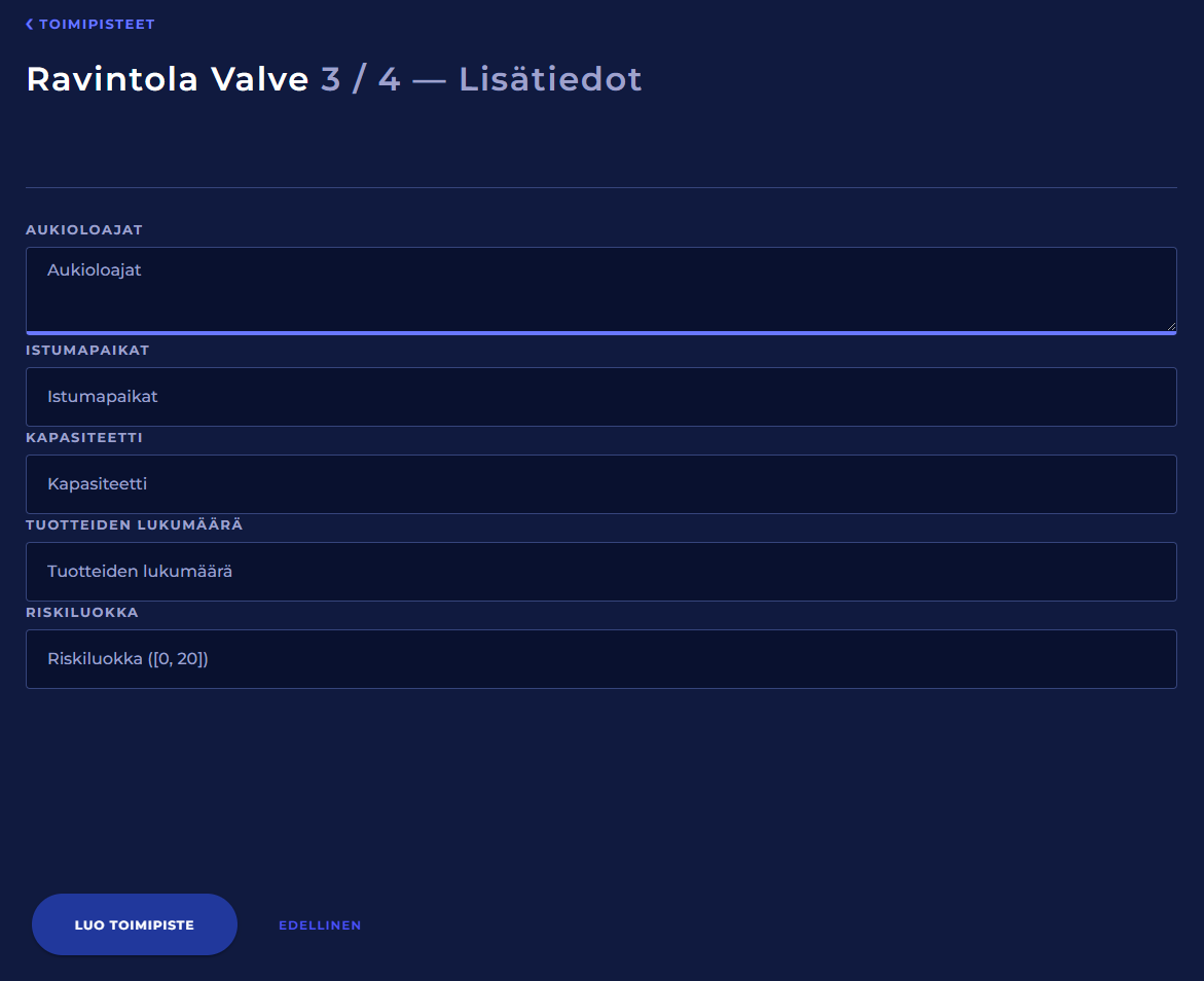 Syötä haluamasi valinnaiset tiedot ja napsauta Luo toimipiste siirtyäksesi viimeiseen, neljänteen vaiheeseen. Voit palata edelliseen vaiheeseen napsauttamalla Edellinen (jo syöttämäsi tiedot säilyvät) tai peruuttaa uuden toimipisteen luomisen < Toimipisteet -linkistä.