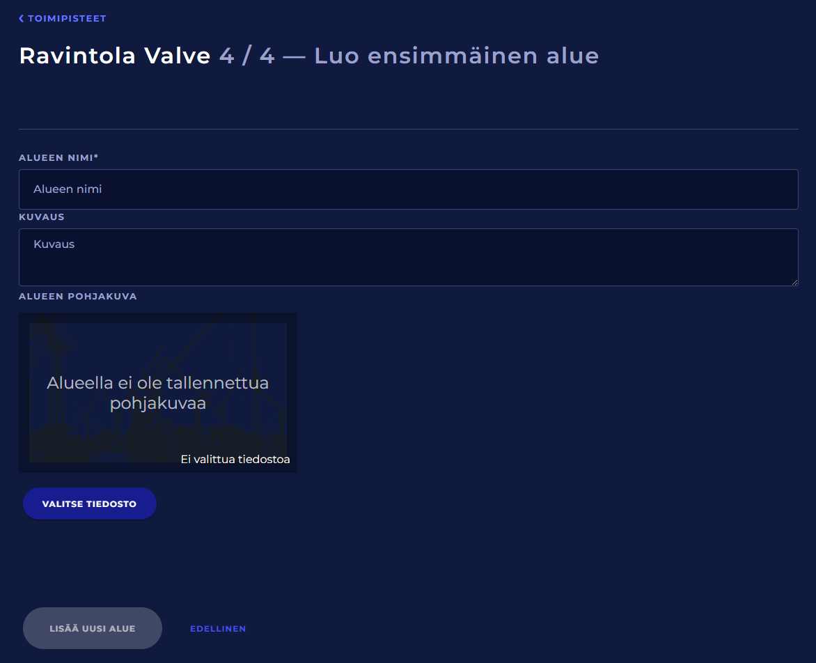 Napsauta lopuksi Lisää uusi alue -painiketta. Voit palata edelliseen vaiheeseen napsauttamalla Edellinen (jo syöttämäsi tiedot säilyvät) tai peruuttaa uuden toimipisteen luomisen < Toimipisteet -linkistä.