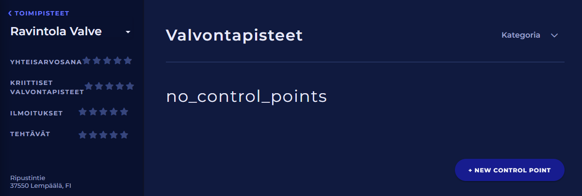 Kun uusi toimipiste ja sen ensimmäinen alue on luotu, siirryt toimipisteen Valvontapisteet-välilehdelle, josta voit jatkaa luomalla ensimmäisen valvontapisteen napsauttamalla +Uusi valvontapiste -painiketta. Lue lisää täältä: Toimipiste | Valvontapisteen-luominen