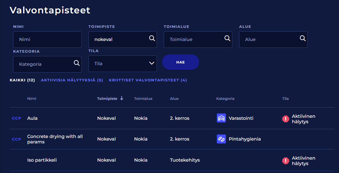 Valvontapisteet-sivun kautta näet luettelon kaikista valvontapisteistäsi, riippumatta siitä millä toimipisteellä ne sijaitsevat. Voit etsiä, suodattaa ja järjestellä valvontapisteitä useilla eri tavoilla.